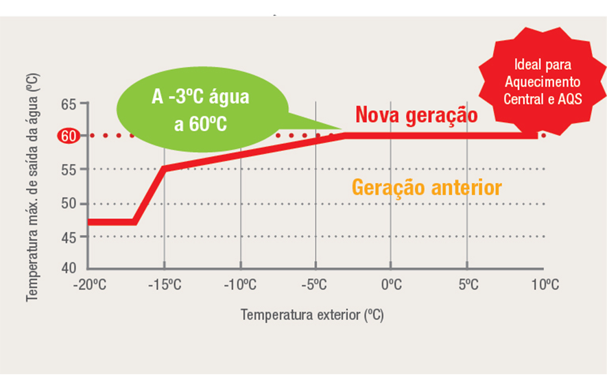 As unidades exteriores Ecodan estão optimizadas para um aquecimento que permite obter água a 60ºC, à saída da bomba de calor, mesmo a temperaturas exteriores negativas, somente com recurso a um único compressor.
