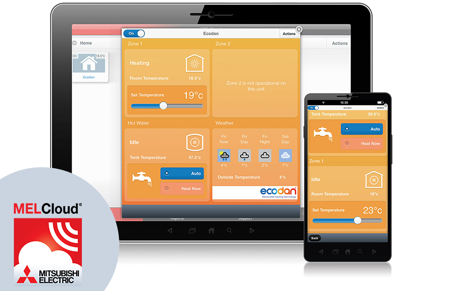 Com a utilização do interface MELCloud, o funcionamento do sistema de aquecimento ou produção de AQS pode ser controlado à distância, a partir de um PC, tablet ou smartphone, com ligação à internet. Além das funções principais, o MELCloud também proporciona informação meteorológica, proteção de congelamento, temporizador com programações múltiplas para períodos de 7 dias e modo “Férias”.