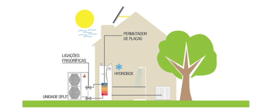 Neste sistema, o permutador de placas refrigerante-água encontra-se na unidade interior, cuja ligação com a unidade exterior